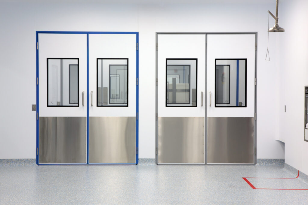 AES Clean Technology manufactures advanced modular door systems engineered for seamless integration into cGMP cleanroom environments. Our specialty doors feature flush designs with prefabricated, welded frames that eliminate crevices for superior contamination control.